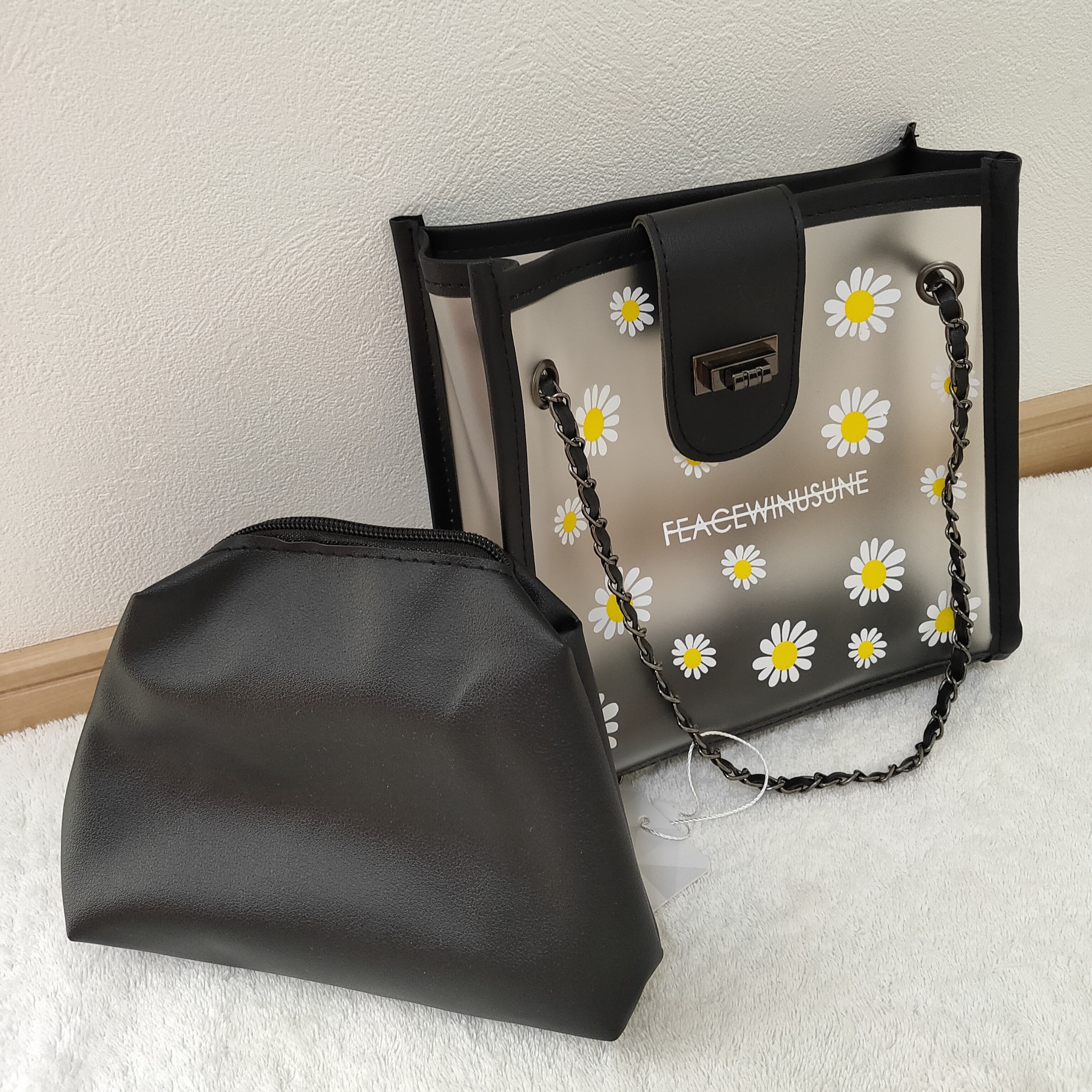 PVCバッグにPUレザーのポーチが付いて、中身が見えず安心。